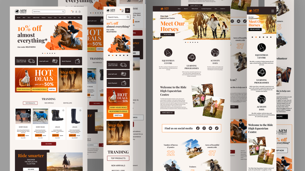 The responsive web design (RWD) e-commerce website project and landing page are focused on creating a website that adapts to different screen sizes and devices, providing a seamless browsing and shopping experience for customers interested in horse riding products and horseback riding. The project involves designing an intuitive user interface with clear navigation, convenient search functionality, and visually appealing product displays. The website aims to showcase a wide range of horse riding products, including equipment, apparel, and accessories, with detailed descriptions and high-quality images. The RWD approach ensures that the website is accessible and user-friendly on desktop computers, laptops, tablets, and mobile devices.